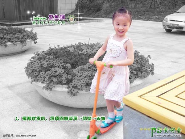 PS照片调色教程实例,photoshop给儿童照片调出可爱的紫色调,本教程简单介绍人物照片的快速美化和调色。原图素材背景部分感觉比较杂乱,作者换上了一张比较漂亮的背景。调色基本上两步就可以了。可见人物调色并不需要多复杂,整体好看就可以了。
