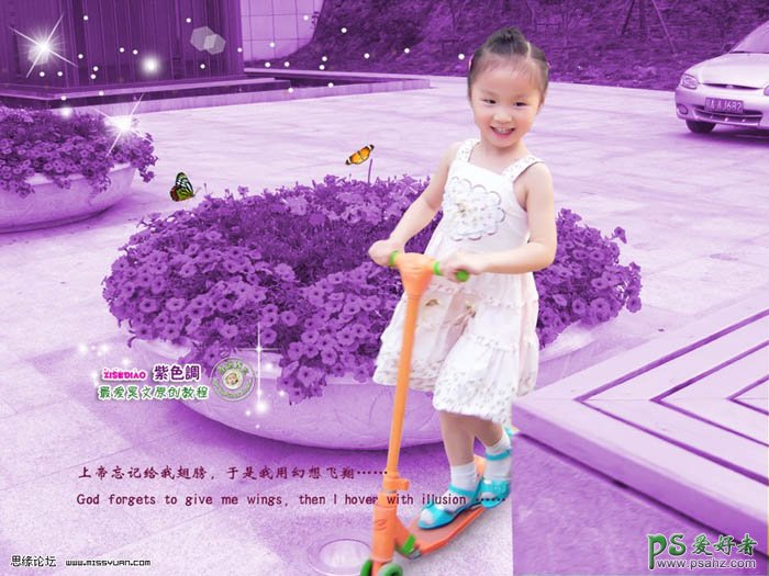PS照片调色教程实例,photoshop给儿童照片调出可爱的紫色调,本教程简单介绍人物照片的快速美化和调色。原图素材背景部分感觉比较杂乱,作者换上了一张比较漂亮的背景。调色基本上两步就可以了。可见人物调色并不需要多复杂,整体好看就可以了。