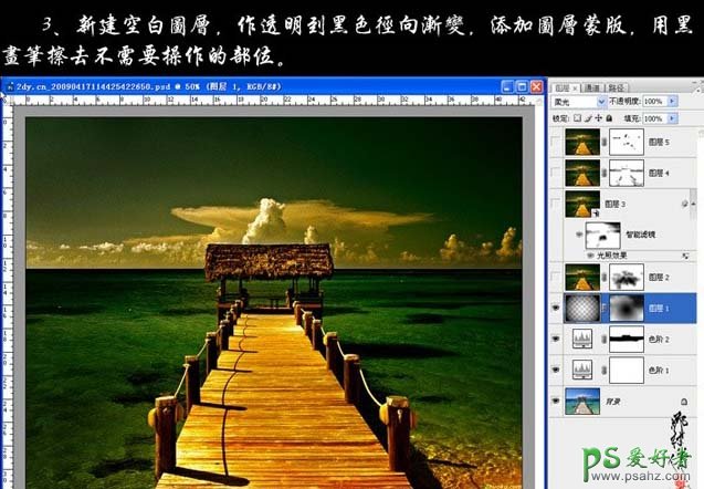 3、新建一个图层,选择渐变工具,颜色设置为黑色到透明渐变,然后由中间拉出径向渐变。加上图层蒙版,用黑色画笔擦去不需要操作的部分。