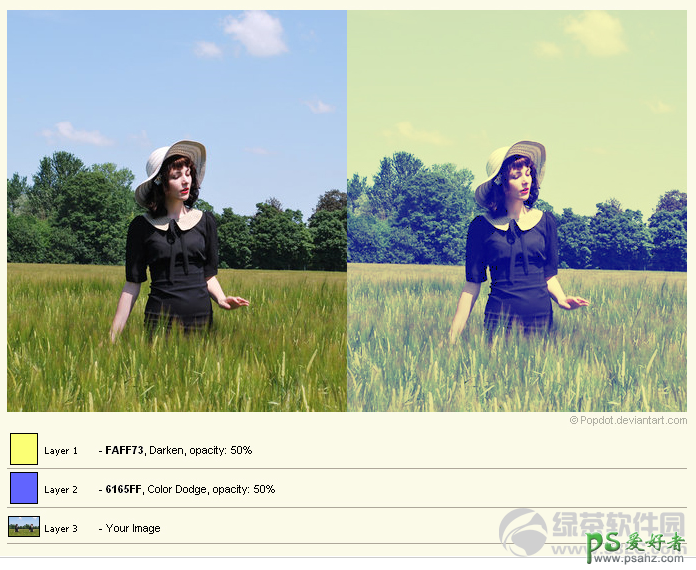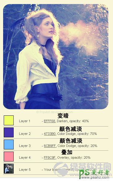 3、新建图层,填充颜色#FAFF73,模式:变暗,不透明度:50%
