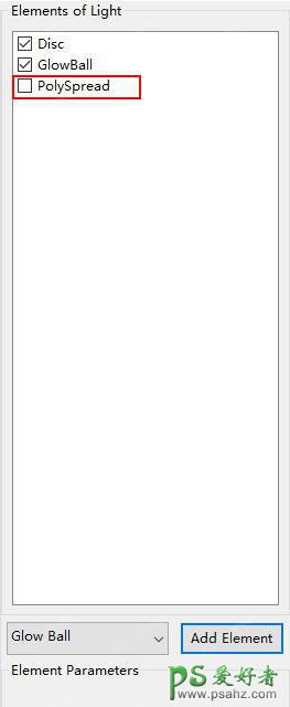 04 完成上一步操作之后,接下来,在右侧的【光源组件】面板中,去掉PolySpread选项,以滤除不自然的光晕衍射效果。