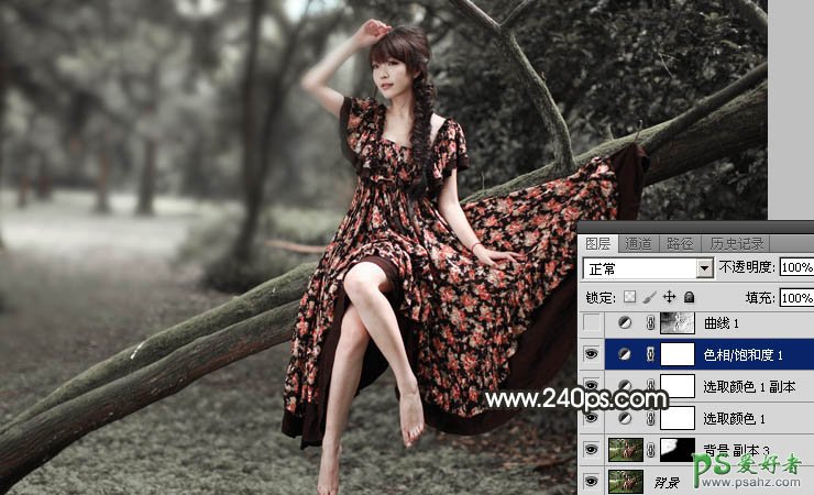 4、创建色相/饱和度调整图层,对黄色,绿色进行调整,参数及效果如下图。这一步快速把背景主色转为中性色。