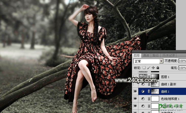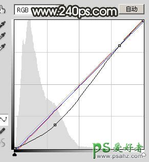 5、按Ctrl + Alt + 2 调出高光选区,按Ctrl + Shift + I 反选得到暗部选区,然后创建曲线调整图层,对RGB、红、蓝通道进行调整,参数及效果如下图。这一步把图片暗部区域调暗一点,并减少红色。