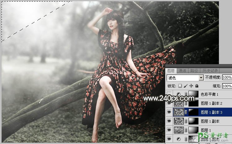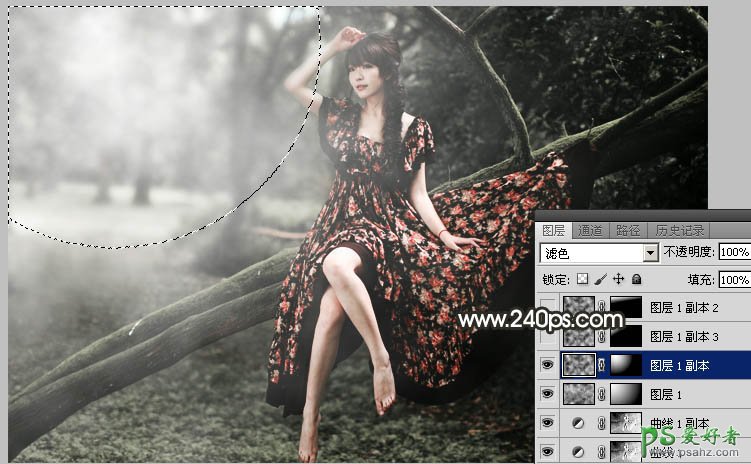 9、同上的方法把左上角及顶部区域稍微涂亮一点,效果如下图。这几步给图片左上角区域增加较淡的烟雾效果。
