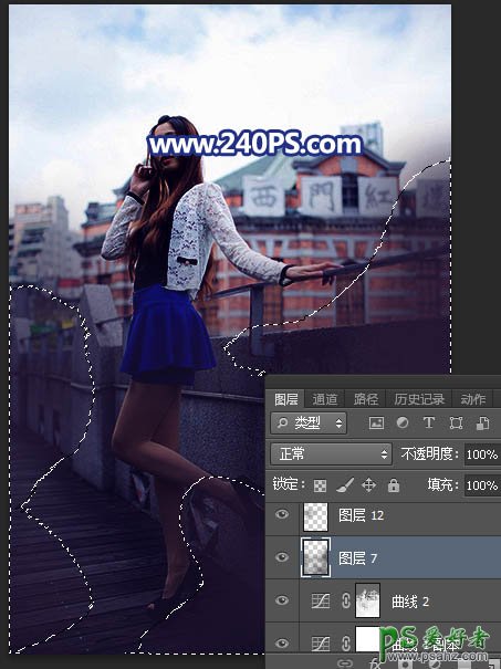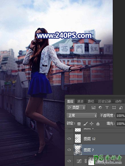 Photoshop给长腿美女模特外景照片调出蓝紫色霞光色彩。
