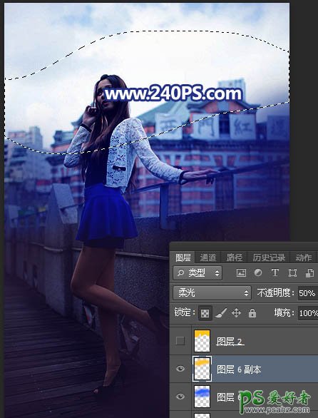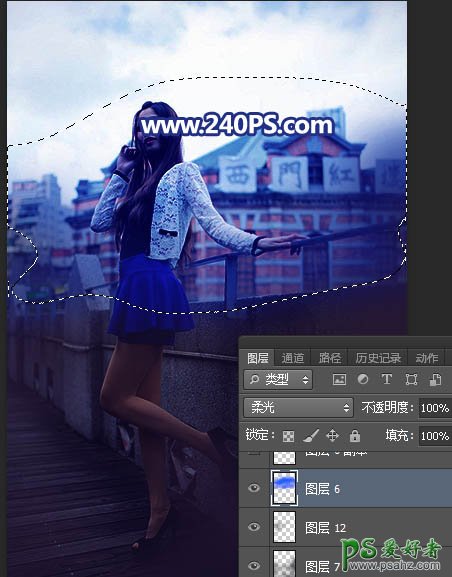 5、局部渲染冷色。新建一个图层,用套索工具勾出下图所示的选区,羽化50个像素后填充蓝色#1B60FA,按Ctrl + D 取消选区后把混合模式改为“柔光”,如下图。