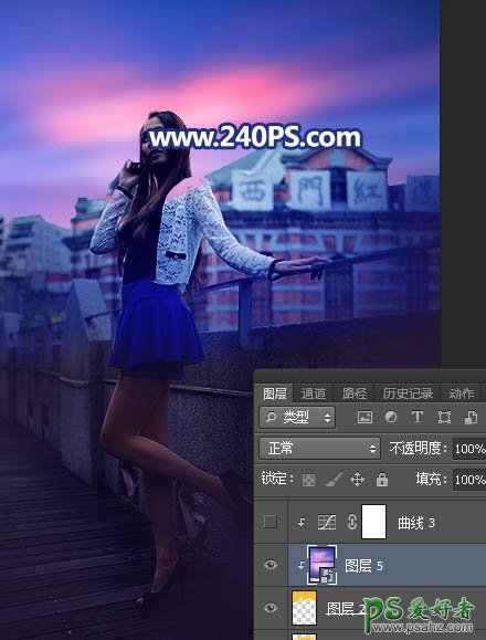 Photoshop给长腿美女模特外景照片调出蓝紫色霞光色彩。