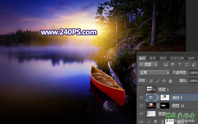 PS风景照调色实例:给平静的湖景照片加上唯美的日出效果。