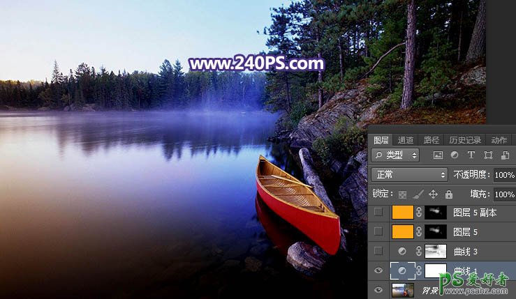 PS风景照调色实例:给平静的湖景照片加上唯美的日出效果。