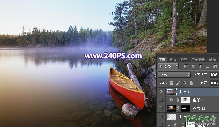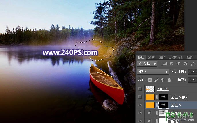 3、水面上增加高光。创建纯色填充图层,颜色设置为橙黄色#FCA703,确定后把混合模式改为“滤色”,再把蒙版填充黑色;然后用透明度为10%的柔边白色画笔把水面右上角区域涂亮一点,如下图。