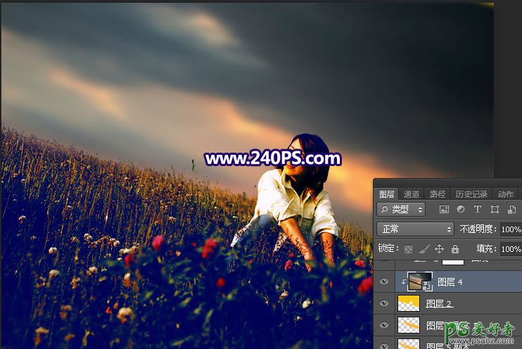 PS调色教程:学习给山坡上自拍的漂亮淑女图片调出黄调晨曦色彩。