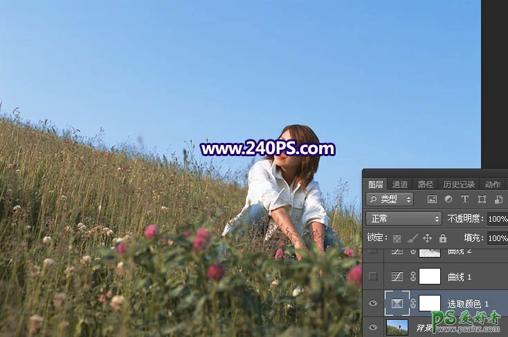 PS调色教程:学习给山坡上自拍的漂亮淑女图片调出黄调晨曦色彩。