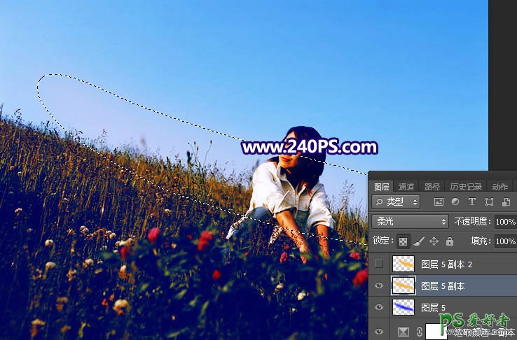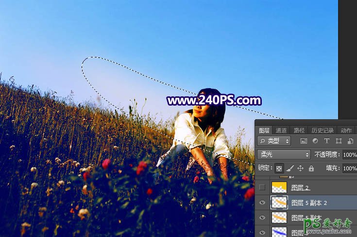 8、新建一个图层,用套索工具勾出下图所示的选区,羽化50个像素后填充橙黄色#F8B709,取消选区后把混合模式改为“柔光”,如下图。