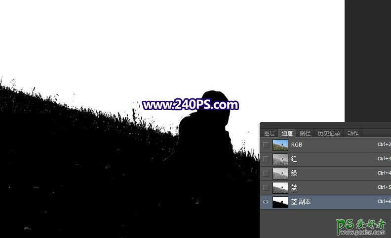 10、进入通道面板,把蓝色通道复制一份,得到蓝副本通道;按Ctrl + L 对蓝副本通道调整色阶,天空区域都调成白色,其它区域压暗;然后用柔边黑色画笔把天空以外的区域涂黑,如下图。