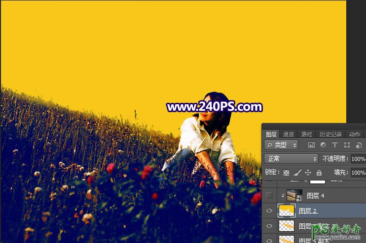 PS调色教程:学习给山坡上自拍的漂亮淑女图片调出黄调晨曦色彩。