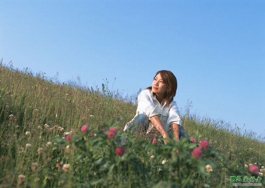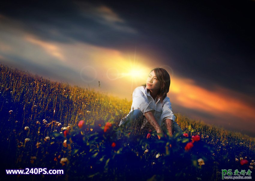 PS调色教程:学习给山坡上自拍的漂亮淑女图片调出黄调晨曦色彩。