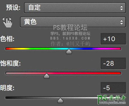 将黄色色相往绿色调整,降低饱和和明度。