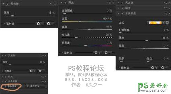nik sofware Color Efex Pro4滤镜,我添加了三个滤镜效果,天光镜、阳光、古典柔焦,参数如下,依旧看感觉调整。