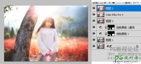 color efex pro4图层自带蒙版,然后我们用橡皮擦工具擦出,效果不需要太强烈的部分(脸部、衣服)不透明度和流量低一些。
