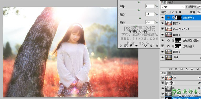 发现树干太黑,点图像-调整-可选颜色,黑色里减一点黑色加一点黄,OK,调整到此结束,是不是很简单呢?
