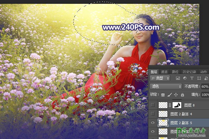 20、新建一个图层,用椭圆选框工具拉出下图所示的选区,羽化45个像素后填充橙黄色#F5E23E,取消选区后把混合模式改为“滤色”,不透明度改为60%,如下图。