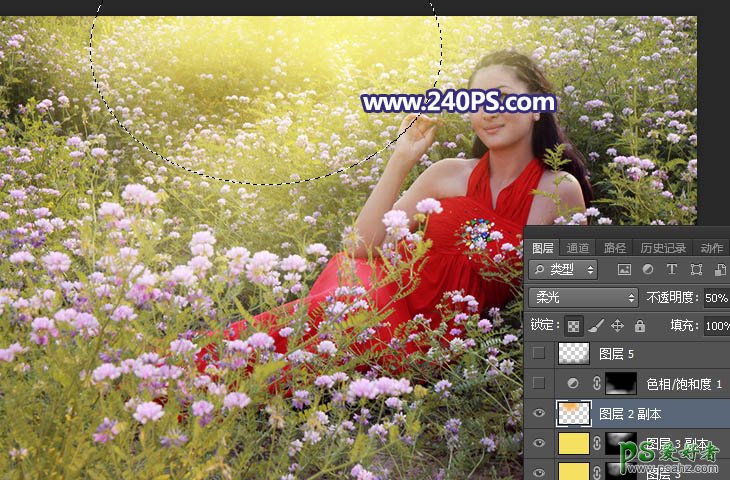 7、新建一个图层,用椭圆选框工具拉出下图所示的选区,羽化60个像素后填充橙黄色#F5B43E,按Ctrl + D 取消选区后把混合模式改为“柔光”,不透明度改为50%,如下图。