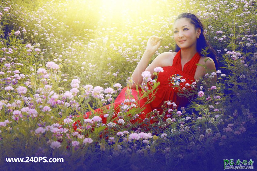 PS调色教程:给花园中拍摄的性感女人照片调出唯美的紫色,阳光色