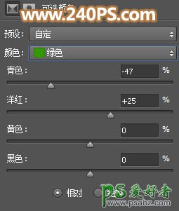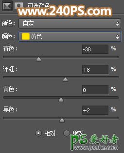 Photoshop给公园外景拍摄的性感高跟美女照片调出唯美的霞光色。 最终效果 原图 1、微调背景颜色。打开原图素材,创建可选颜色调整图层,对黄色,绿色进行调整,参数及效果如下图。 2、把图片暗部区域大幅压暗。创建曲线调整图层,对RGB
