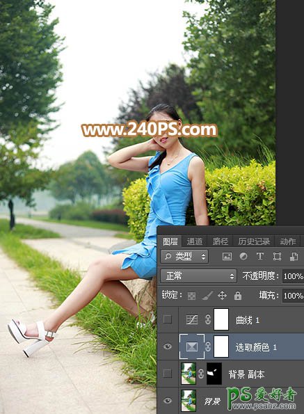 PS美女图片调色:给红色短裙黑丝美女森系写真照调出唯美的中...