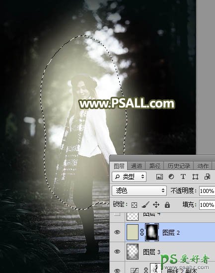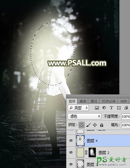 8、创建纯色调整图层,颜色设置为黄灰色#D9D9BD,确定后把混合模式改为“滤色”,再把蒙版填充黑色;然后用透明度为10%的柔边白色画笔把下图选区部分涂亮一点。