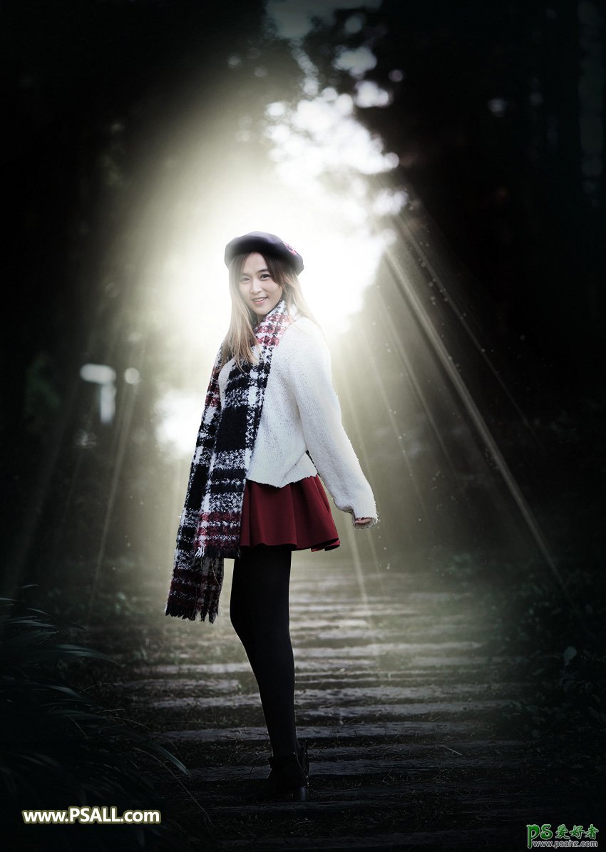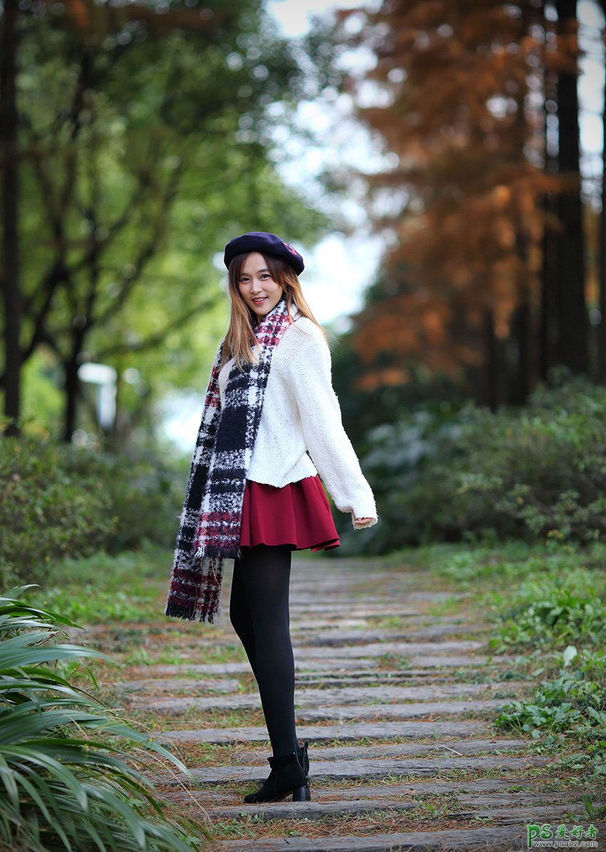PS美女图片调色:给红色短裙黑丝美女森系写真照调出唯美的中性灰