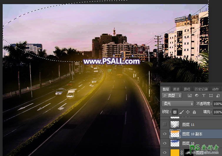 8、新建一个图层,用套索工具勾出下图所示的选区,羽化60个像素后填充橙黄色#FAAA1D,取消选区后把混合模式改为“柔光”,如下图。