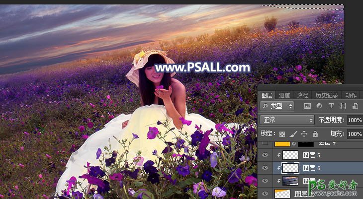 15、新建一个图层,创建剪切蒙版,把前景色设置为暗蓝色#635C7C,然后用透明度为10%的柔边画笔把天空右上角区域稍微涂暗一点,如下图。
