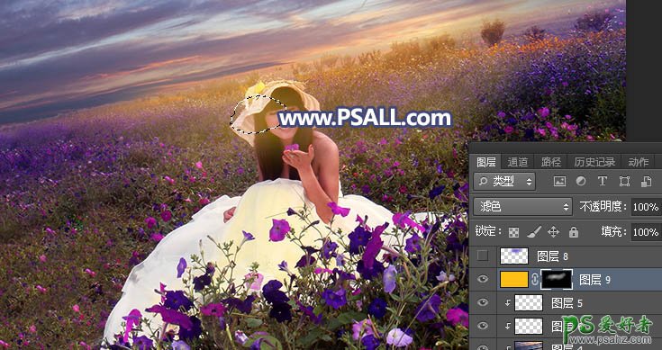 16、草地局部渲染高光。创建纯色调整图层,颜色设置为橙黄色#FEC003,确定后把混合模式改为“滤色”,再把蒙版填充黑色;然后用透明度为5%的柔边白色画笔把人物头部周围的地面部分涂亮一点,如下图。
