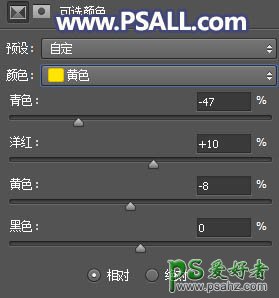 PS婚片调色教程:给花丛中拍摄的漂亮mm婚纱照调出完美的日出效果,模拟出日出的环境;让画面变得更加唯美意境。 最终效果 原图 1、给草地部分增加暖色。打开原图素材大图,创建可选颜色调整图层,对黄色,绿色进行调整,参数及效果如下图。 2、