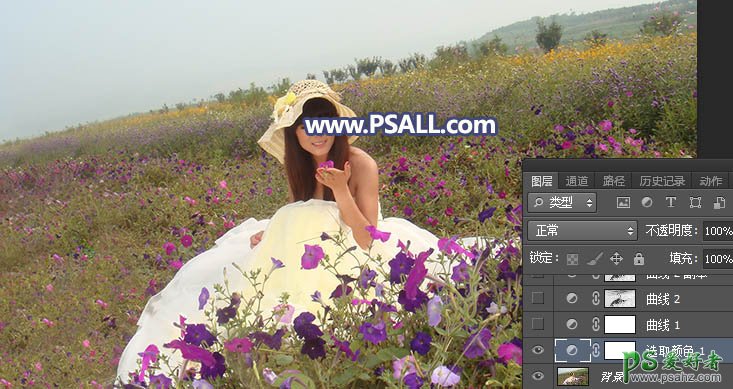 PS婚片调色教程:给花丛中拍摄的漂亮mm婚纱照调出完美的日出效果