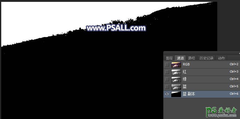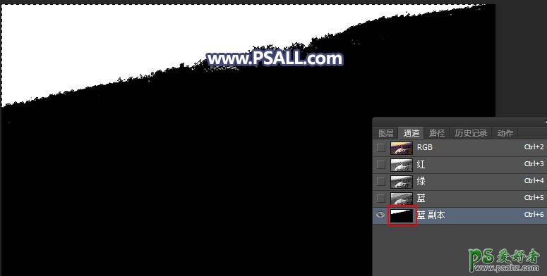 12、按住Ctrl键 + 鼠标左键点击蓝副本通道缩略图,载入天空选区,如下图。