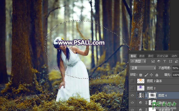 6、同上的方法调出暗部选区,然后创建纯色调整图层,颜色设置为黑色;确定后用柔边黑色画笔把下图选区部分擦出来,再把图层不透明度设置为50%,如下图。
