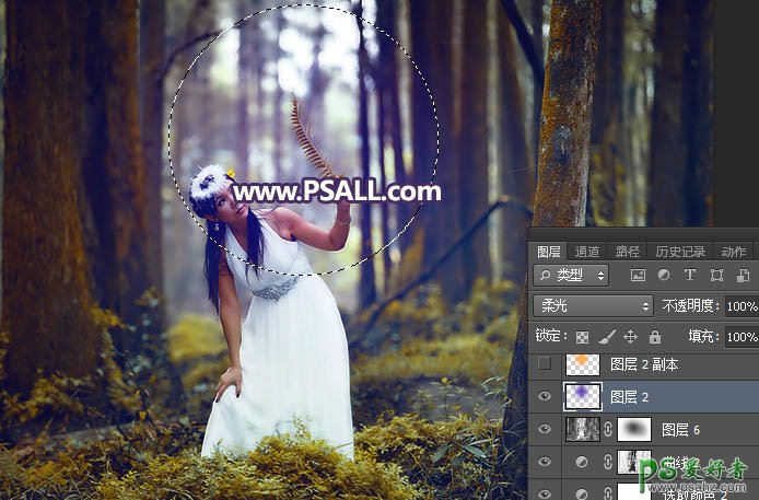 7、中间区域渲染高光。新建一个图层,用椭圆选框工具拉出下图所示的选区,羽化55个像素后填充蓝紫色#5E2AB5,按Ctrl + D 取消选区后把混合模式改为“柔光”,如下图。