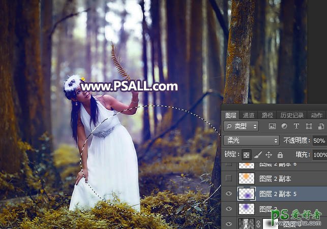 8、新建一个图层,用椭圆选框工具拉出下图所示的选区,羽化55个像素后填充同上的蓝紫色,取消选区后把混合模式改为“柔光”,不透明度改为50%,如下图。