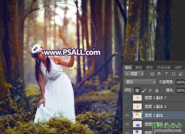 9、新建一个图层,用椭圆选框工具拉出下图所示的选区,羽化55个像素后填充橙黄色#FAAA1D,取消选区后把混合模式改为“柔光”。