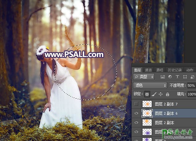 10、新建一个图层,用椭圆选框工具拉出下图所示的选区,羽化45个像素后填充橙黄色#FAAA1D,取消选区后把混合模式改为“滤色”,不透明度改为50%,如下图。