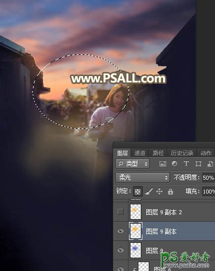 15、新建一个图层,把选区填充橙黄色#FCB802,取消选区后把混合模式改为“柔光”,不透明度改为50%,如下图。