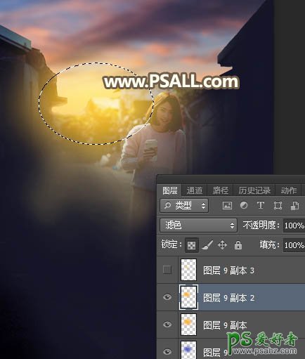 16、新建一个图层,用椭圆选框工具拉出下图所示的选区,羽化50个像素后填充同上的橙黄色,取消选区后把混合模式改为“滤色”。