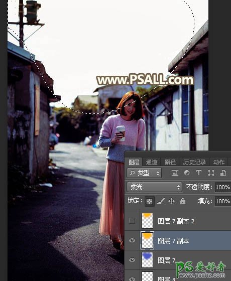 5、新建一个图层,把选区填充橙黄色#FCB802,按Ctrl + D 取消选区后把混合模式改为“柔光”,如下图。