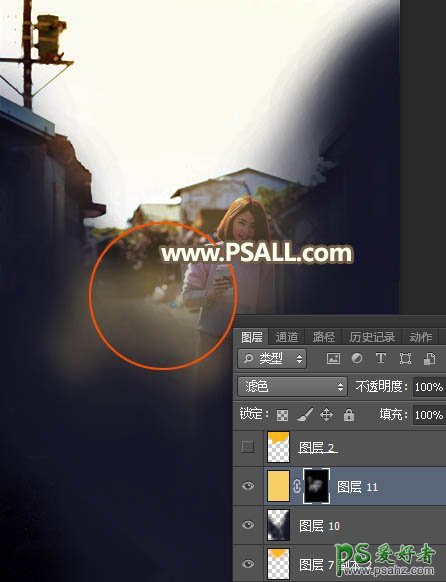 8、局部增加柔和高光。创建纯色调整图层,颜色设置为橙黄色#F9D063,确定后把混合模式改为“滤色”,再把蒙版填充黑色;然后用透明度为10%的柔边白色画笔把下图红圈位置稍微涂亮一点。