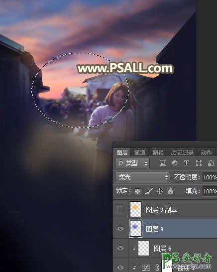 14、渲染高光。新建一个图层,用椭圆选框工具拉出下图所示的选区,羽化50个像素后填充蓝色#4B59C4,暂时不用取消选区,把混合模式改为“柔光”,如下图。