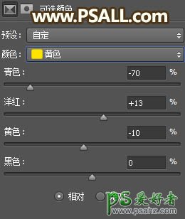 4、创建可选颜色调整图层,对黄色进行调整,参数及效果如下图。
