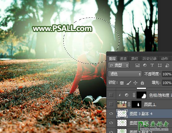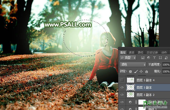 9、新建一个图层,用椭圆选框工具拉出下图所示的选区,羽化45个像素后填充淡绿色#ABCC9A;取消选区后把混合模式改为“滤色”,如下图。
