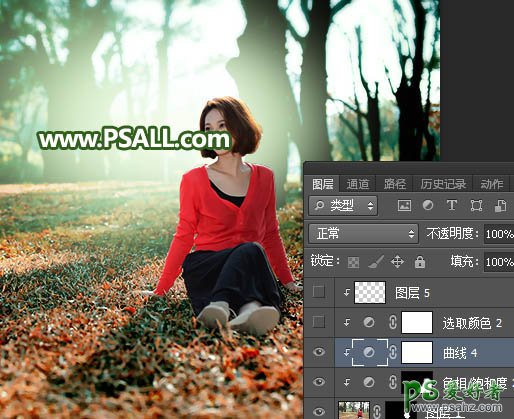 PS调色教程:给树林中的红衣美女性感照片调出逆光暗调青红色效果
